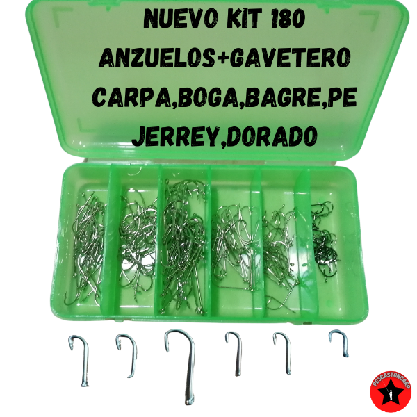 KIT 180 Anzuelos Carpa,Boga,Bagre,Pejerrey,Dorado + Gavetero Color Segun Stock